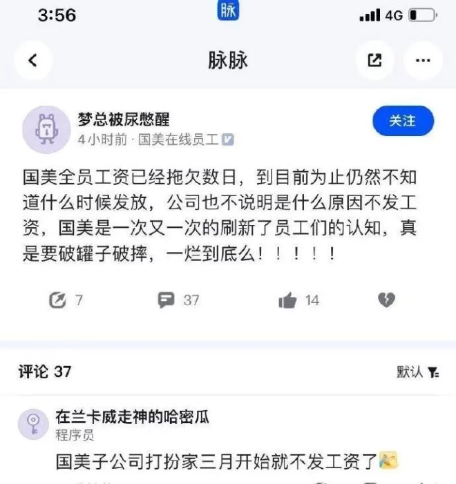 也有脈脈認證為國美在線的員工表示,國美全員工資已經(jīng)拖欠數(shù)日,到目前仍不知道什么時候發(fā)放。