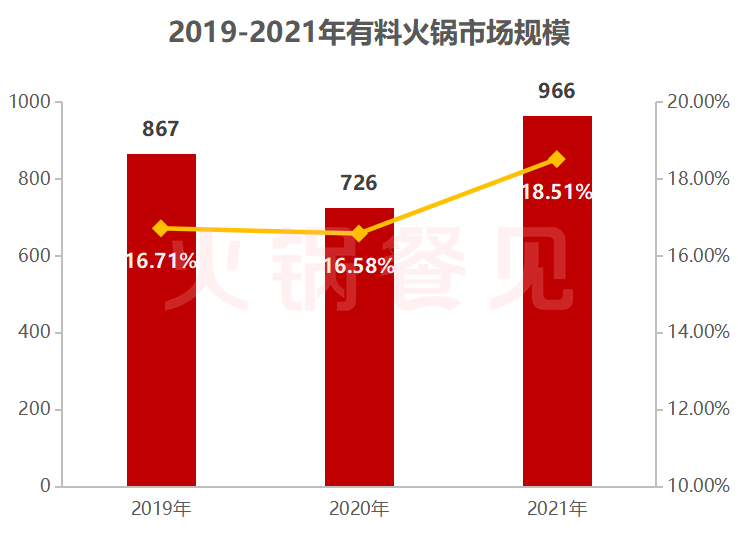 據(jù)《2022中國火鍋大數(shù)據(jù)報(bào)告》,有料火鍋(包括魚蛙類、豬肚雞、椰子雞、蝦火鍋和羊肉火鍋等)市場(chǎng)規(guī)模從2019年的867億元增長至2021年的966億元。