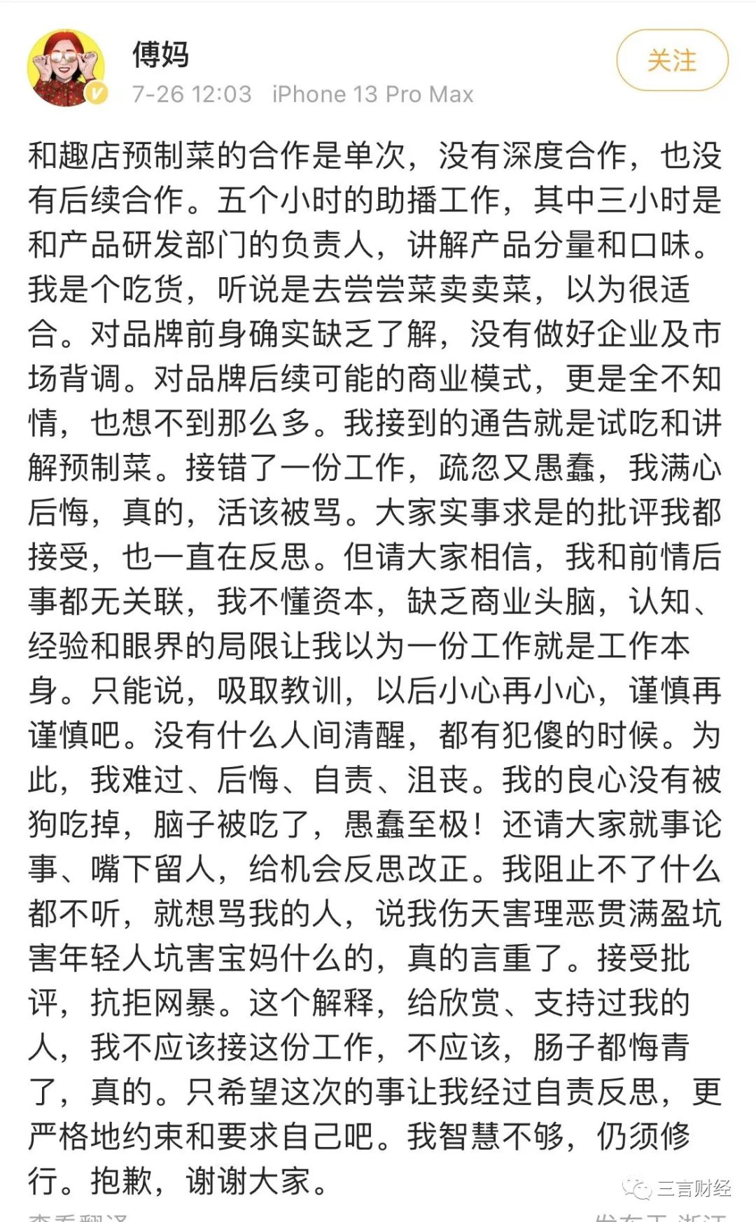 對(duì)于外界質(zhì)疑,傅首爾解釋稱(chēng),自己對(duì)品牌前身確實(shí)缺乏了解,沒(méi)有做好企業(yè)及市場(chǎng)背調(diào)。對(duì)品牌后續(xù)可能的商業(yè)模式,更是全不知情,也想不到那么多。自己接到的通告就是試吃和講解預(yù)制菜。接錯(cuò)了一份工作,“疏忽又愚蠢”“滿(mǎn)心后悔”。