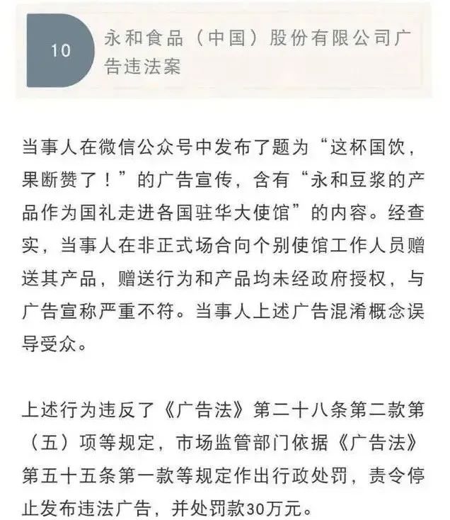 3、公眾號(hào)違規(guī):永和豆?jié){發(fā)文自稱(chēng)“國(guó)飲”,被罰30萬(wàn)
