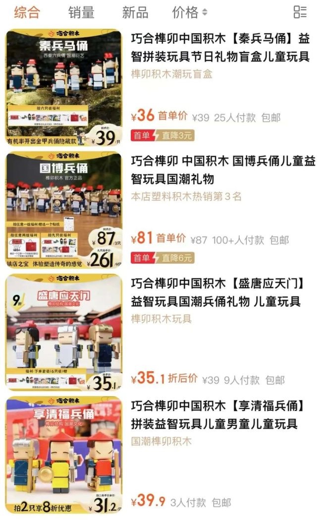 而巧合積木與國家博物館合作開發(fā)的“中國古代兵傭系列”受到了玩家的廣泛好評。財經(jīng)無忌在其天貓官方旗艦店上觀察發(fā)現(xiàn),“中國古代兵傭系列”目前包含了我國9個朝代的兵傭造型,全套售價261元,總銷量1000+。