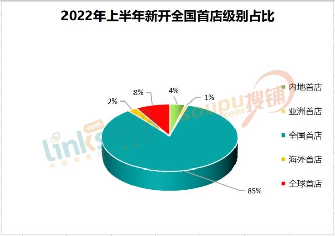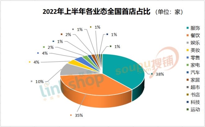 統(tǒng)計(jì)顯示,上半年共開(kāi)出130家全國(guó)首店,其中服飾49家,占比38%,餐飲45家,占比35%,娛樂(lè)13家,占比10%,其余業(yè)態(tài)如美妝、零售、家電、汽車(chē)等占比較少。