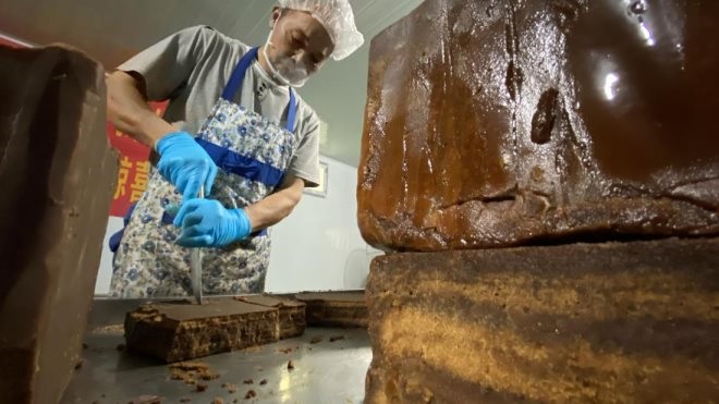 ▲“古法”師傅正直播現(xiàn)切紅糖。 攝影 楊野