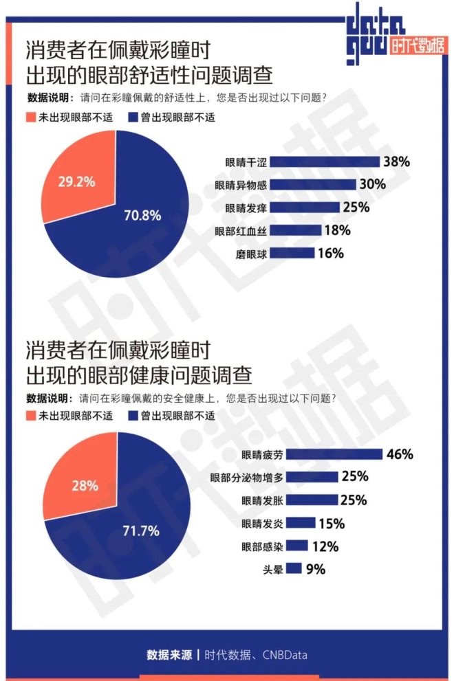 購買了劣質、不合適的產品以及佩戴彩瞳手法有誤都有可能引起眼部健康問題。調研數據顯示,超七成用戶在配戴彩瞳時曾出現眼部健康問題,眼睛疲勞、分泌物增多、眼睛發(fā)漲為高發(fā)癥狀;另有七成彩瞳配戴者曾出現過眼睛干澀、有異物感、發(fā)癢等眼不適問題。