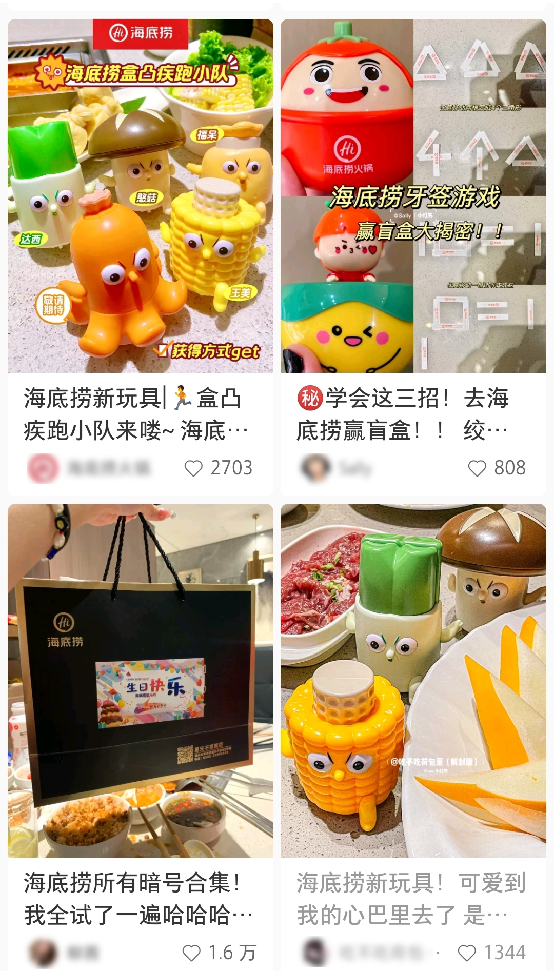 這一點(diǎn),老顧客的感知最深,社交媒體上經(jīng)常能看到一些博主曬自己收藏的一大堆海底撈玩具,而且他們往往是海底撈的金海、黑海會(huì)員。這說(shuō)明,玩具已經(jīng)成為海底撈與老粉絲之間的粘合劑。
