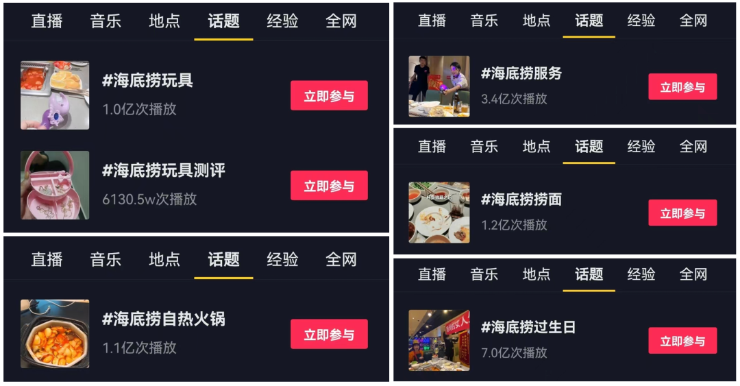 一個(gè)有意思的數(shù)據(jù)是,在抖音話題中,播放量跟“海底撈玩具”(1億次)同一數(shù)量級(jí)的,還有“海底撈自熱火鍋”(1.1億次)、“海底撈撈面”(1.2億次)、“海底撈過(guò)生日”(3.4億次)、“海底撈服務(wù)”(7億次)。