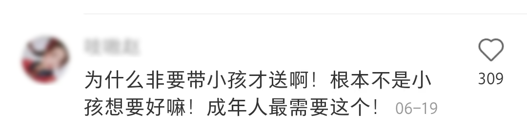 有網(wǎng)友直呼,“為什么非要帶小孩才送。「静皇切『⑾胍寐!成年人最需要這個(gè)!”一條評(píng)論竟獲贊300多,跟評(píng)無(wú)數(shù)。