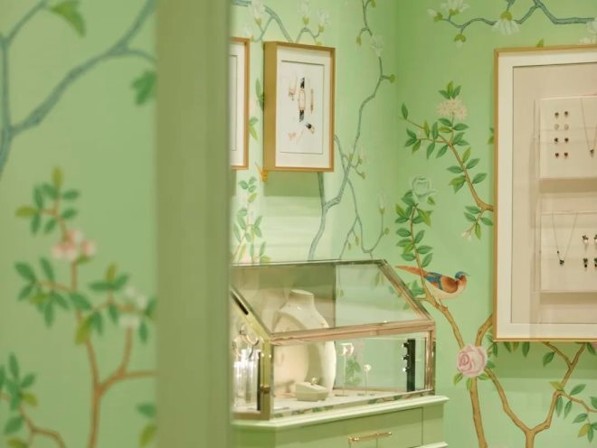除了必需的產品陳列,Lola Rose還在店鋪中設置了“孔雀石生長過程”、“寶石珍寶墻”、“設計師手繪墻”三個互動裝置,分別展示了品牌在寶石原料及設計靈感方面的理念與追求。在為顧客提供更多新奇的購物體驗的同時,也在通過這種方式,向顧客傳達Lola Rose的品牌文化,拉近品牌與消費者之間的距離。