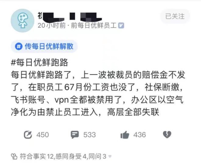 對于裁員一事,早在7月上旬就已有每日優(yōu)鮮員工在脈脈上進行爆料。有認(rèn)證為每日優(yōu)鮮前員工的用戶稱,“在職員工6、7月份工資也沒了,社保斷繳”等。另有員工稱,每日優(yōu)鮮裁員從3、4月份便已開始,原來2000多名員工,現(xiàn)今不足900人。