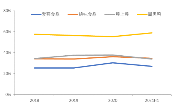 在這種模式下,于紫燕食品這類品牌公司而言,可以覆蓋到更廣泛的消費群體,但弊端在于這種渠道下的毛利率并不高,2020年紫燕食品預(yù)包裝產(chǎn)品的毛利率在25.13%,低于鮮貨食品的30.08%。