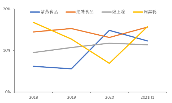 費用方面,相較于“鹵味三巨頭”,紫燕食品的期間費用率整體較低。由于2021年會計準則變化,原本歸屬于銷售費用科目的運輸費用重分類至營業(yè)成本,為保證數(shù)據(jù)的可比性,將2020年和2021年上半年的運輸費用包含在銷售費用率內(nèi),經(jīng)計算得,2020年紫燕食品調(diào)整后的銷售費用率僅為6.79%,大幅低于同期周黑鴨和煌上煌的42.2%和15.5%。