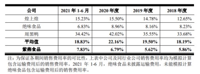 2018-2021H1紫燕食品與同行銷售費用率對比 資料來源:紫燕食品招股說明書,36氪整理