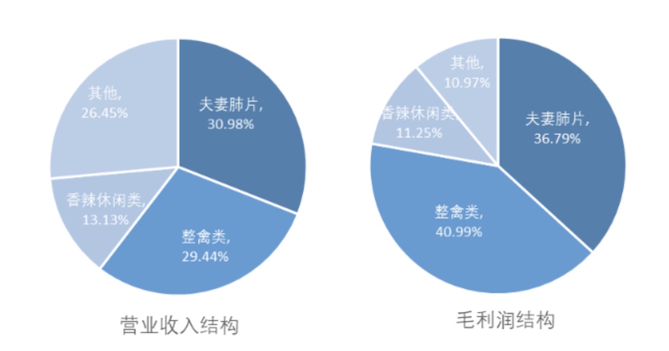 營收結(jié)構(gòu)方面,以佐餐鹵制品為主,休閑鹵制品為輔的紫燕食品,鮮貨食品占據(jù)9成左右,擁有夫妻肺片等明星爆款單品,整禽類(百味雞、藤椒雞、甜皮鴨、熏香鹵鵝)也常常成為消費者喜愛的“下酒菜”。大單品夫妻肺片的營收占比常年達3成以上,接著是整禽類營收占比近30%。也就是說這兩類產(chǎn)品撐起了紫燕食品的半壁江山。而且二者的毛利占比更是接近8成,其中,2020年夫妻肺片毛利占比約37%,而整禽類毛利占比超40%。