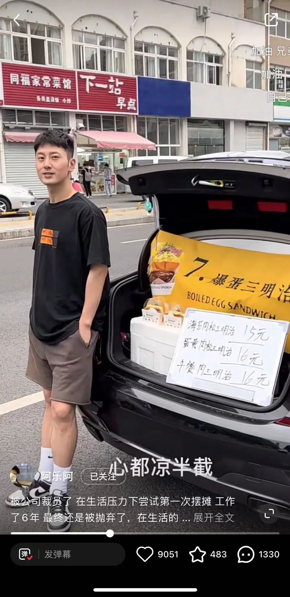 偌大的車尾箱后,掛著一張“爆蛋三明治”的黃色橫幅;白色泡沫板作為招牌,寫著三明治的品種和標(biāo)價(jià);在車尾箱旁,穿著黑色上衣的阿樂(lè)雙手插兜,面帶微笑——他正等待今天的第一個(gè)客人。