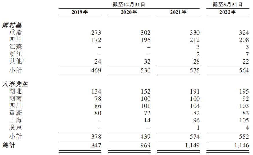 而鄉(xiāng)村基在今年1月份提交的招股書顯示,截至到2021年9月30日,他們的門店總數(shù)是1145家。如此對(duì)比,從2021年9月底到2022年5月底,這8個(gè)月里,鄉(xiāng)村基的門店數(shù)量只凈增長(zhǎng)了1家。