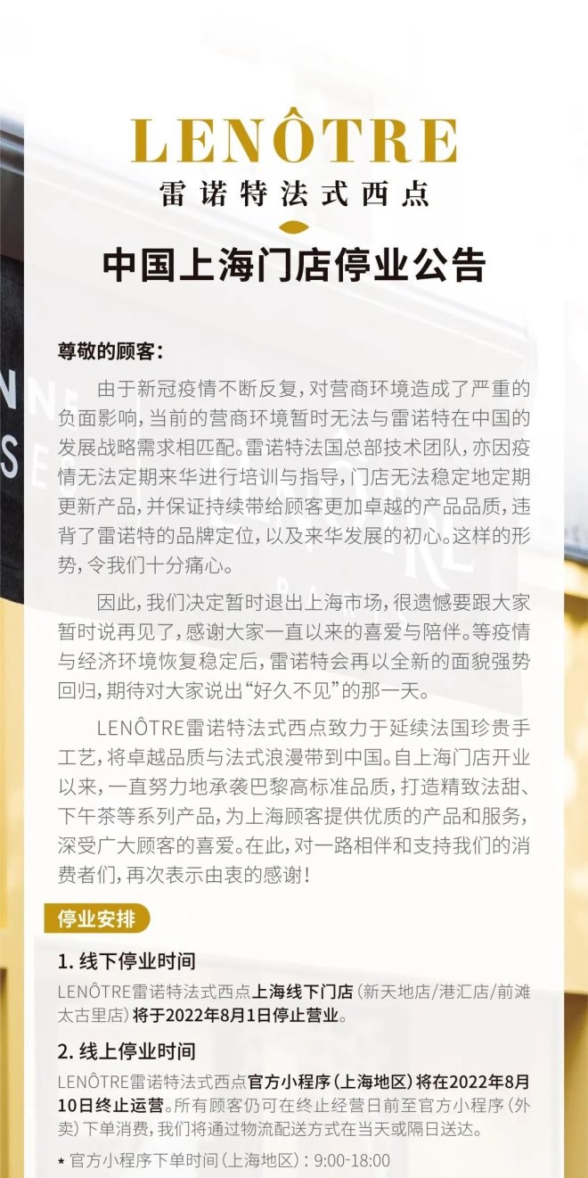 8月1日,LENOTRE雷諾特法式西點(diǎn)(以下簡(jiǎn)稱“雷諾特”)發(fā)布公告稱,將于今日停止經(jīng)營(yíng)該品牌上海線下門店,并決定暫時(shí)退出上海市場(chǎng)。另外,雷諾特官方小程序(上海地區(qū))也將在2022年8月10日終止運(yùn)營(yíng)。