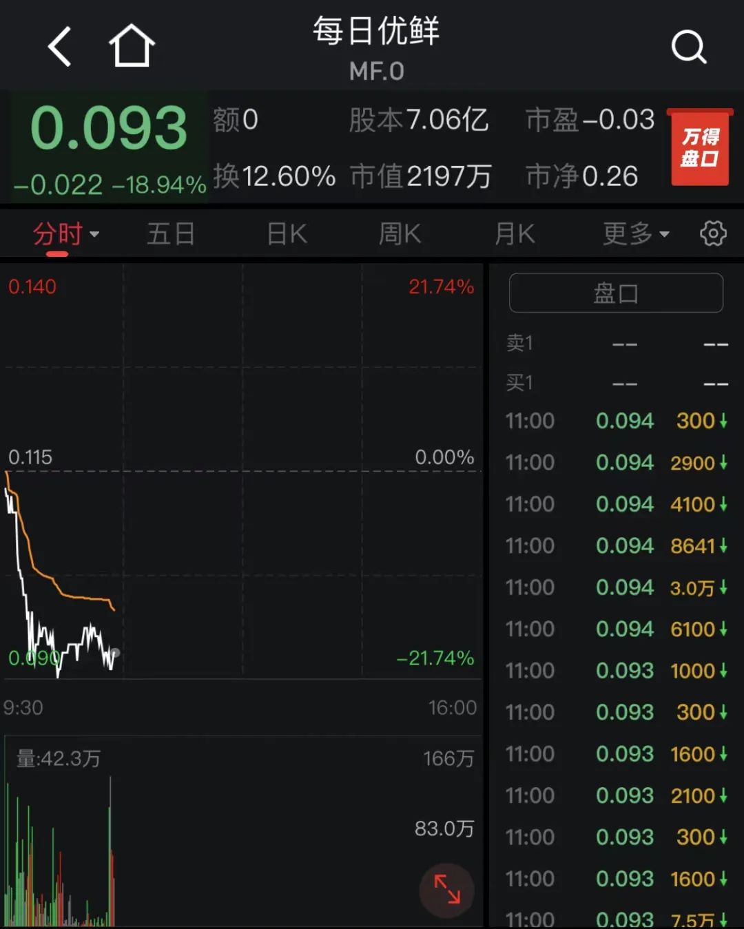截至發(fā)稿,萬得股票顯示,每日優(yōu)鮮美股市值縮水至2225萬美元,價(jià)格為0.095美元/股,跌幅為17.90%。