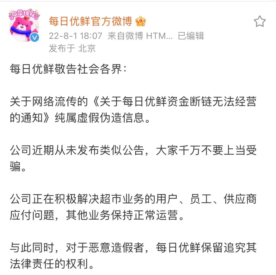8月1日,每日優(yōu)鮮辟謠一則“無法正常經(jīng)營,資金斷鏈”的通知,稱其為假信息。