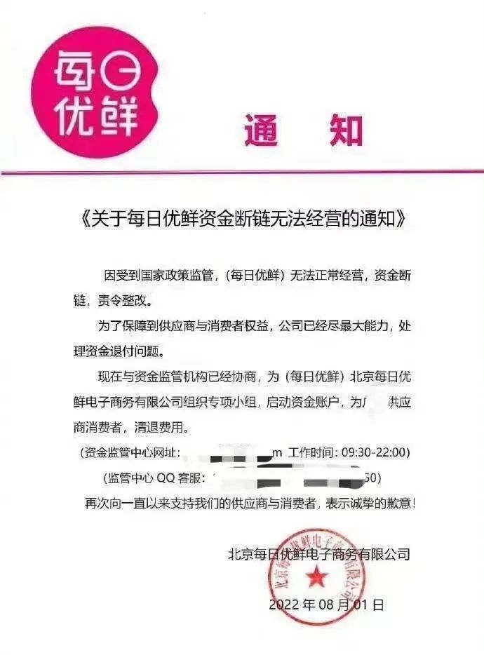 8月1日,一則名為《關(guān)于每日優(yōu)鮮資金斷鏈無法經(jīng)營的通知》很快在網(wǎng)絡(luò)上傳播開來。其顯示,因受到國家政策監(jiān)管,每日優(yōu)鮮無法正常經(jīng)營,資金斷鏈,責(zé)令整改。為了保障到供應(yīng)商與消費(fèi)者權(quán)益,公司已經(jīng)盡最大能力,處理資金退付問題。現(xiàn)在與資金監(jiān)管機(jī)構(gòu)已經(jīng)協(xié)商,為北京每日優(yōu)鮮電子商務(wù)有限公司組織專項(xiàng)小組,啟動(dòng)資金賬戶,為廣大供應(yīng)商消費(fèi)者清退費(fèi)用。