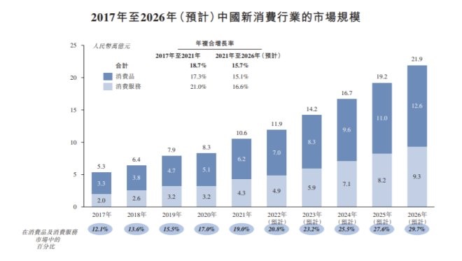 一方面,根據(jù)灼識咨詢的資料,中國消費行業(yè)的市場規(guī)模從2017年的43.8萬億元增至2021年的55.5萬億元,年復合增長率為6.1%,預計將于2026年達到73.9萬億元。中國消費品投資的黃金時代已經到來;