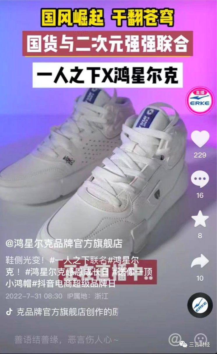 比如這款以水為引的夏禹涂山情侶鞋。鴻星爾克曾多次在其抖音賬號(hào)發(fā)布相關(guān)視頻來(lái)宣傳。