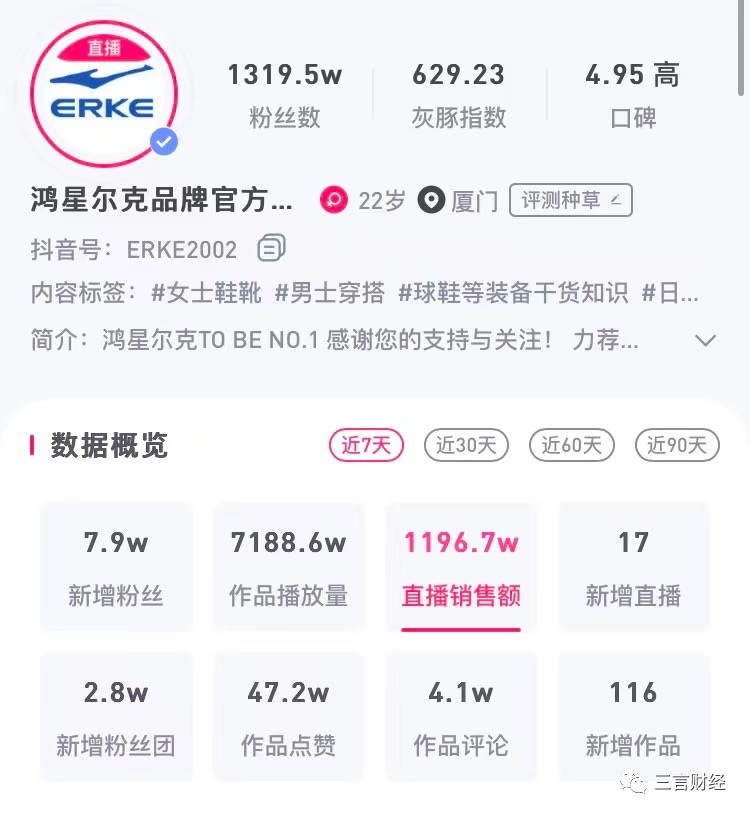 而近7天內(nèi),鴻星爾克品牌官方旗艦店的抖音賬號(hào)的直播銷(xiāo)售總額為1196.7萬(wàn)元。