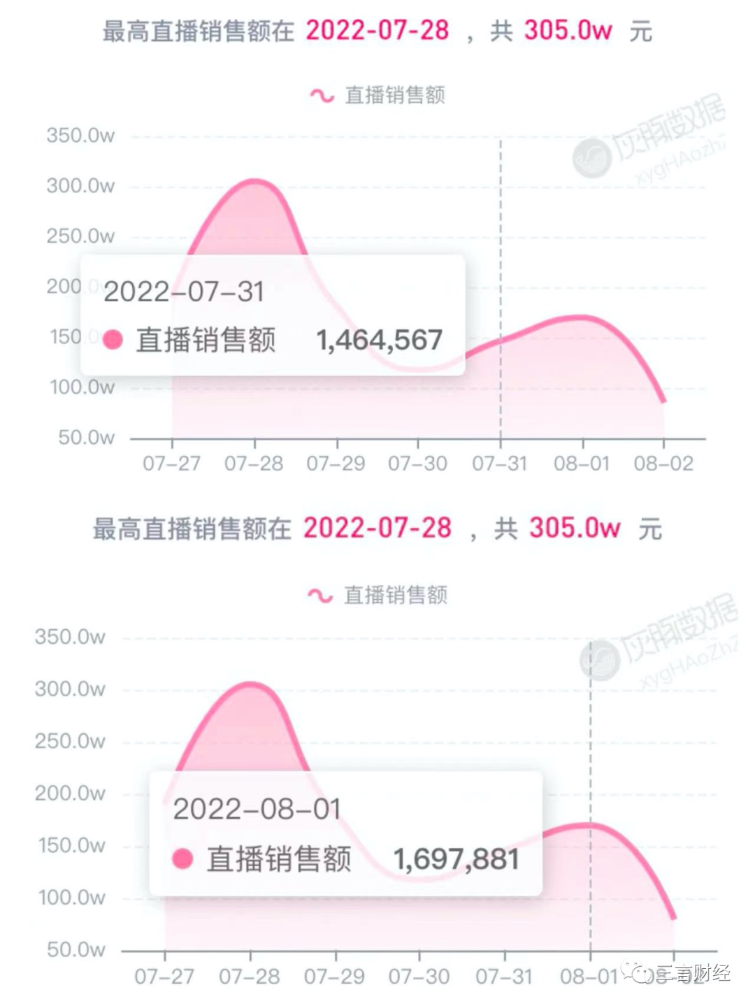 也就是說(shuō),紅星爾克7.31和8.31兩天的直播銷(xiāo)售額在近7天內(nèi)約占1/4,并沒(méi)有什么特別的表現(xiàn)。
