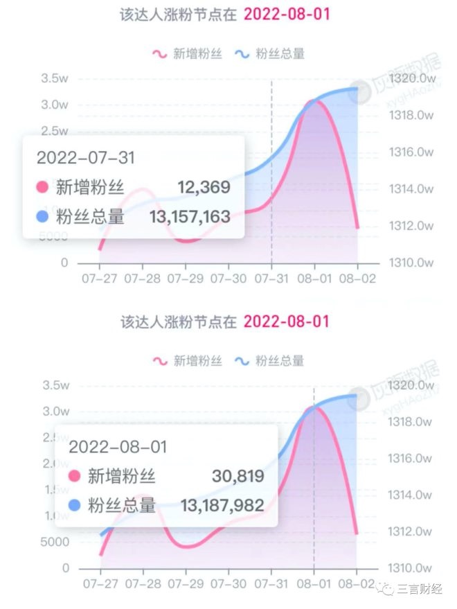 據(jù)第三方數(shù)據(jù)平臺(tái)顯示,鴻星爾克品牌官方旗艦店的抖音賬號(hào)在7月31-8月1日,迎來(lái)一波粉絲增長(zhǎng)。7月31日新增粉絲12369,8月1日新增粉絲30819。