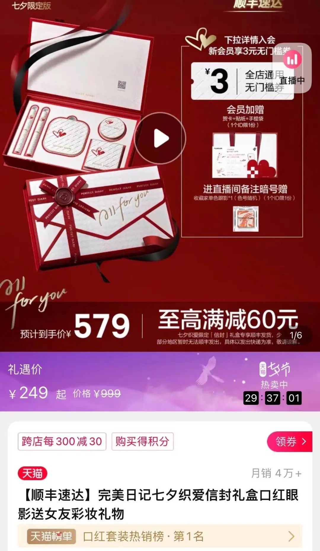 完美日記今年推出的七夕限定信封禮盒售價639元,內(nèi)含一塊腮紅、一盒散粉、一盤眼影、兩支口紅,加上一個禮盒包裝,反倒比單買貴了幾十塊。但這款禮盒月銷量已經(jīng)超過4萬,簡直躺賺。