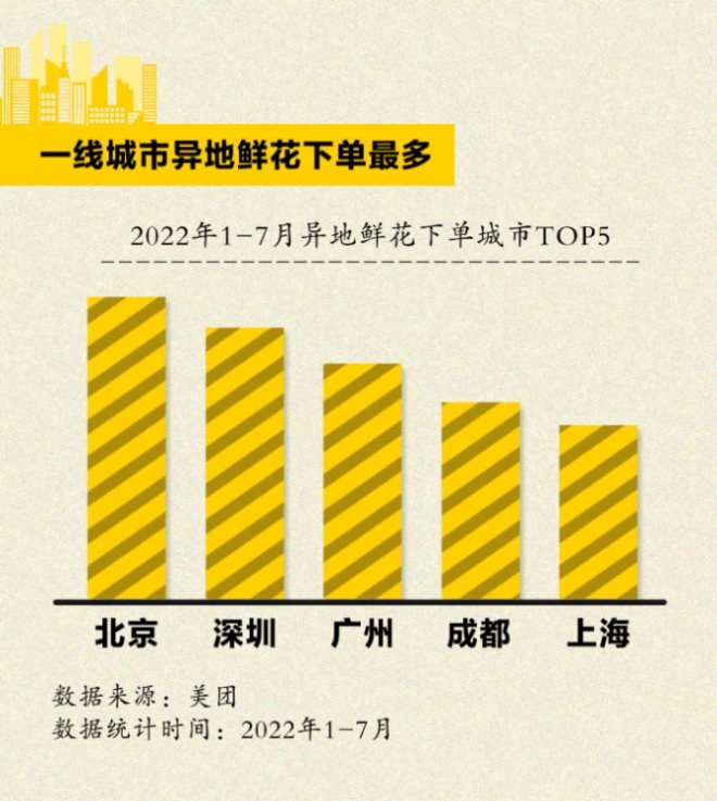 一線城市的年輕人,也是通過外賣平臺下單異地送花的最高頻群體。美團數(shù)據(jù)顯示,今年1至7月,北京、深圳、廣州、成都、上海是下單異地鮮花最高的五座城市。