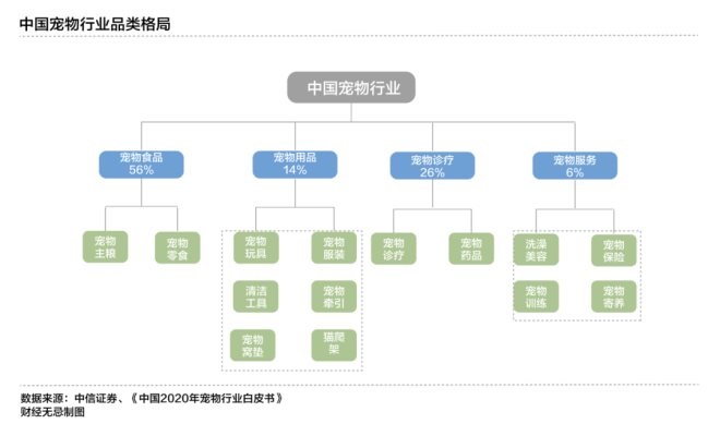 根據(jù)Pethadoop發(fā)布的《中國2020年寵物行業(yè)白皮書》數(shù)據(jù),在中國寵物行業(yè)的千億市場規(guī)模里,寵物食品占比接近六成,寵物診療與寵物服務(wù)占比超三成,而寵物用品占比在僅10%上下。