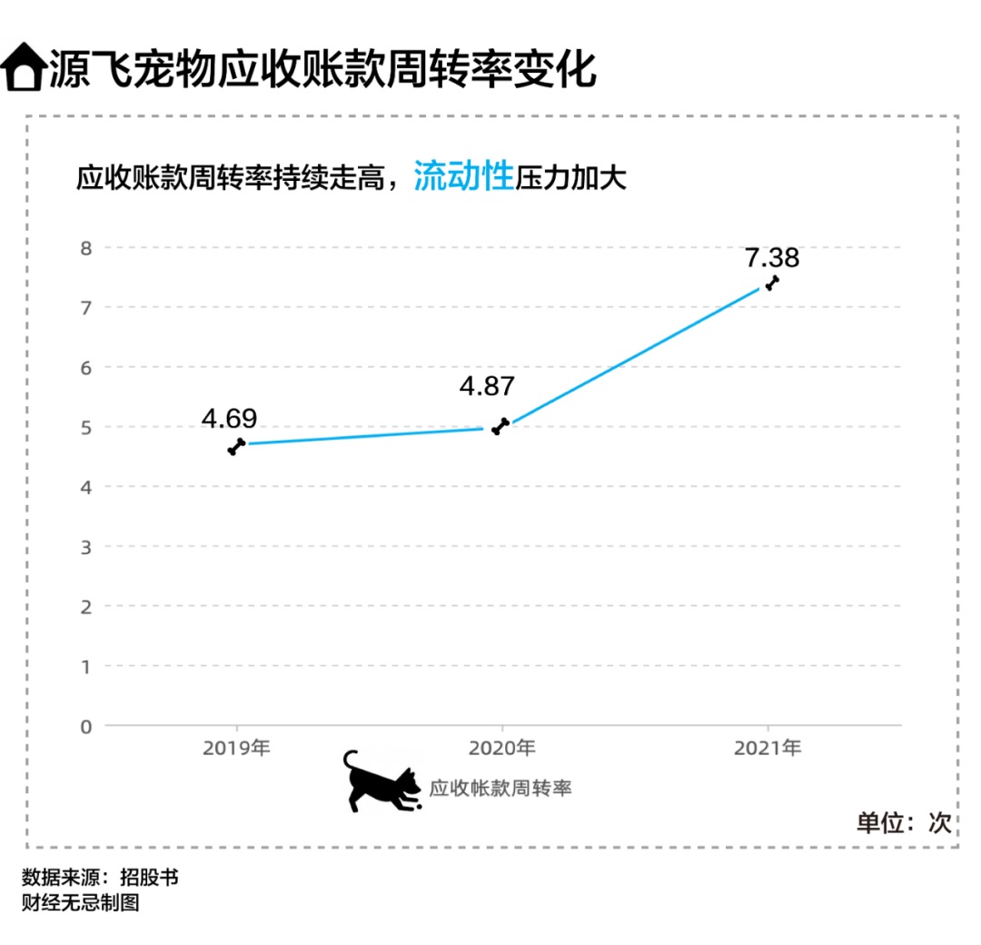其中,源飛寵物應(yīng)收賬款周轉(zhuǎn)率在2021年達(dá)到了7.38次,可比公司如依依股份則為5.4次,佩蒂股份為6次。