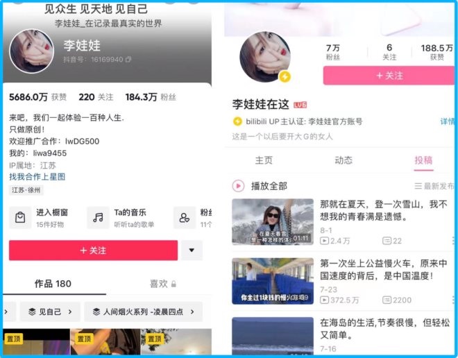 李娃娃在抖音(左)和B站(右)已開通賬號(hào)