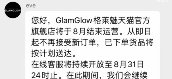 無獨有偶,另一個網(wǎng)紅彩妝品牌GlamGlow格萊魅也在8月到來之際,黯然退場。根據(jù)GlamGlow天貓官方旗艦店客服的回復(fù),品牌將于8月結(jié)束運營,即日起不再接受新訂單,已下單貨品將按計劃送達(dá),在線客服將持續(xù)開放至8月31日24時止。