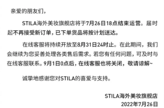 7月26日,彩妝品牌Stila 在其天貓旗艦店發(fā)布公告稱,Stila海外美妝旗艦店將于7月26日18點結(jié)束運營,屆時起不再接受新訂單,已下單貨品將按計劃送達(dá)。在線客服將持續(xù)開放至8月31日24時止,期間,Stila將繼續(xù)為消費者處理各類售后需求,9月1日0點后,在線客服也將關(guān)閉。