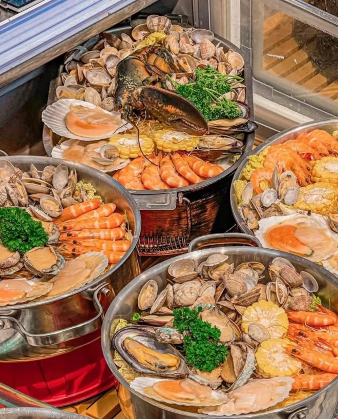 海鮮大咖:這里有各種海鮮拼盤,一份兩到三人份的鮑魚海鮮大咖拼盤里有鮑魚、花蛤、蝦等多種海鮮只要99元,元?dú)夂ur蒸汽鍋129一份,還有青花椒烤鱸魚。