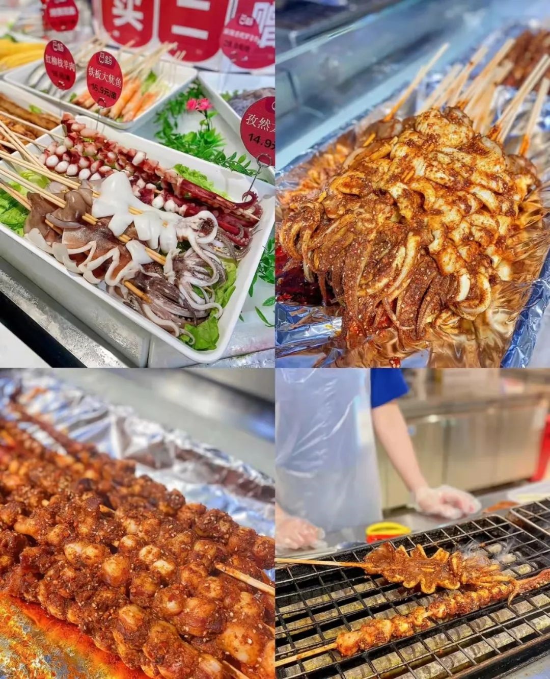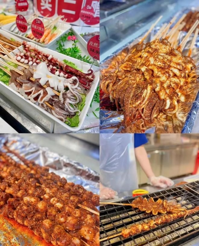 燒烤:超多燒烤品類,不僅有熱銷的9.9元兩串烤羊肉串、16.9元一串鐵板烤魷魚、紅柳枝羊肉大串,還有烤面筋、生蠔、扇貝、雞翅、韭菜等經(jīng)典品類。
