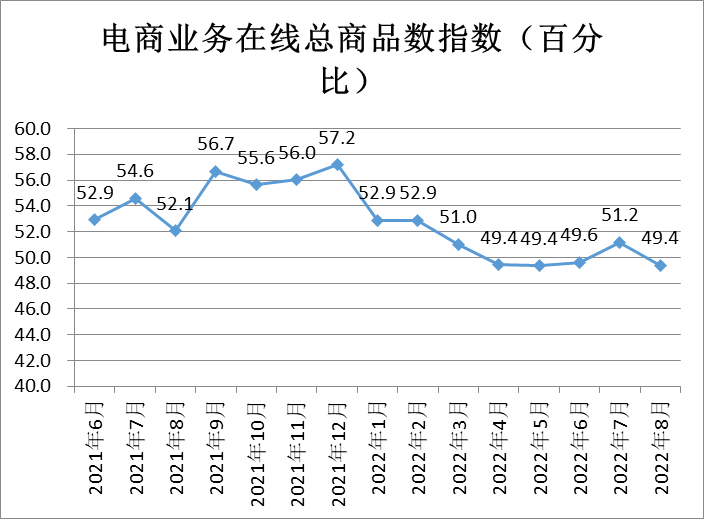 電商業(yè)務(wù)在線總商品數(shù)指數(shù)為49.4%,較上月小幅回落1.8個百分點,表明線上企業(yè)備貨趨于穩(wěn)定。