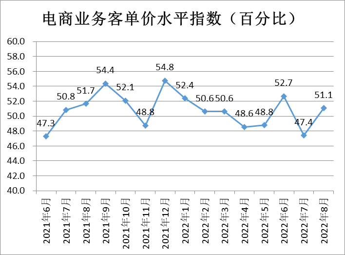 電商業(yè)務(wù)客單價指數(shù)為51.1%,較上月回升3.7個百分點,表明線上商戶預(yù)期8月客單價仍將提升。