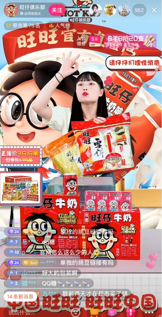 “我們只上30元左右的產(chǎn)品,怕大家野性消費。”8月5日,時代周報記者在旺旺官方直播間“旺仔俱樂部”,主播手上拿著旺旺雪餅進(jìn)行帶貨,直播間右側(cè)標(biāo)上了“請理性消費”的標(biāo)語!白尪觼韼ж洝薄岸由湘溄印薄澳阃彝蠹彝....底下網(wǎng)友紛紛留言點評,并激情下單。