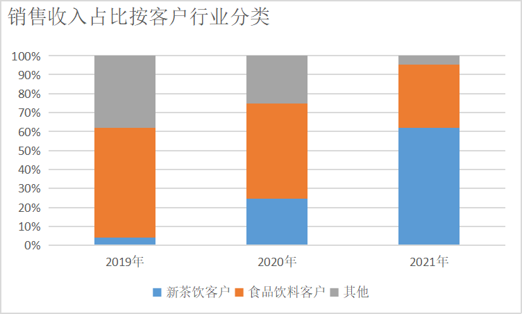 數(shù)據(jù)顯示,田野股份來(lái)自食品飲料客戶的銷售收入占比已經(jīng)從2019年的57.66%降至2021年的33.49%,來(lái)自新茶飲客戶的銷售收入占比則從2019年的4.2%上升到61.82%。