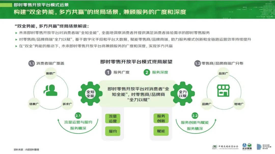 裴亮認(rèn)為,即時(shí)零售是全渠道零售的重要組成部分,它不是單純依靠線上的流量,而是通過對現(xiàn)有線下資源的整合,使得平臺和線下零售商的合作形成一種 1+1>2的能力。線下門店作為履約的終端和商品存儲的終端,加上即時(shí)零售的賦能,價(jià)值得以再利用。