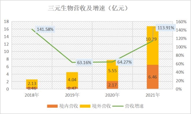 2020年開始,三元生物逐漸成為元?dú)馍帧⑥r(nóng)夫山泉等國內(nèi)品牌的供應(yīng)商,因此迎來業(yè)績爆發(fā)。東方財(cái)富數(shù)據(jù)顯示,2018~2021年,三元生物營收同比增速均維持在60%以上。2020年開始,公司境內(nèi)營收增長明顯。2021年,三元生物境內(nèi)營收達(dá)6.46億元,是2019年的13.7倍。