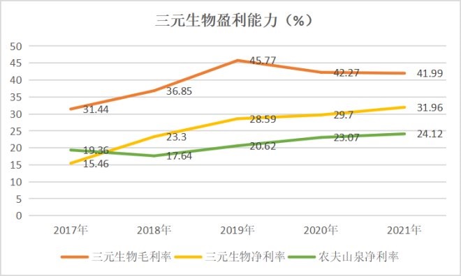 不僅毛利率高,三元生物的凈利率也在2017~2021年間提高了16.5個(gè)百分點(diǎn)。而且,跟下游客戶比起來,三元生物的盈利能力也很強(qiáng),近年來公司的凈利率基本都高于農(nóng)夫山泉。