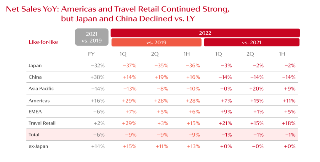 2022上半年,資生堂集團在美洲以及旅游零售的凈銷售額持續(xù)保持強勁增長,但中國和日本銷售額同比均有下降。