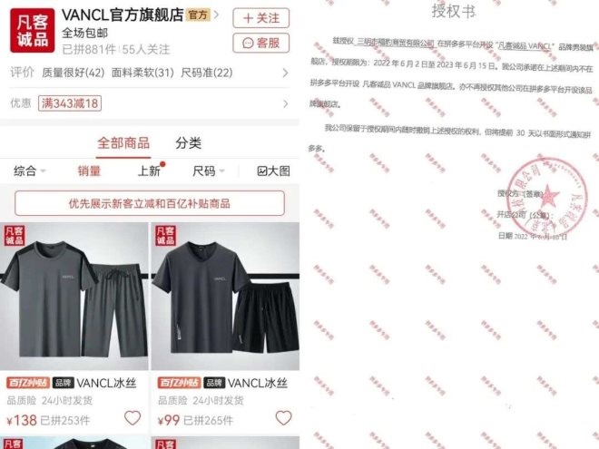 與抖音類似的是,京東、拼多多上同樣出現(xiàn)了許多凡客店鋪。和想象中“山寨店”不同,這些有著凡客名號(hào)的店鋪不少都出具了品牌授權(quán)書(shū),大多店鋪獲得授權(quán)時(shí)間是在今年6—7月,幕后運(yùn)營(yíng)公司也不是同一家,一些店鋪的運(yùn)營(yíng)公司還能在抖音上找到相對(duì)應(yīng)的凡客賬號(hào)。