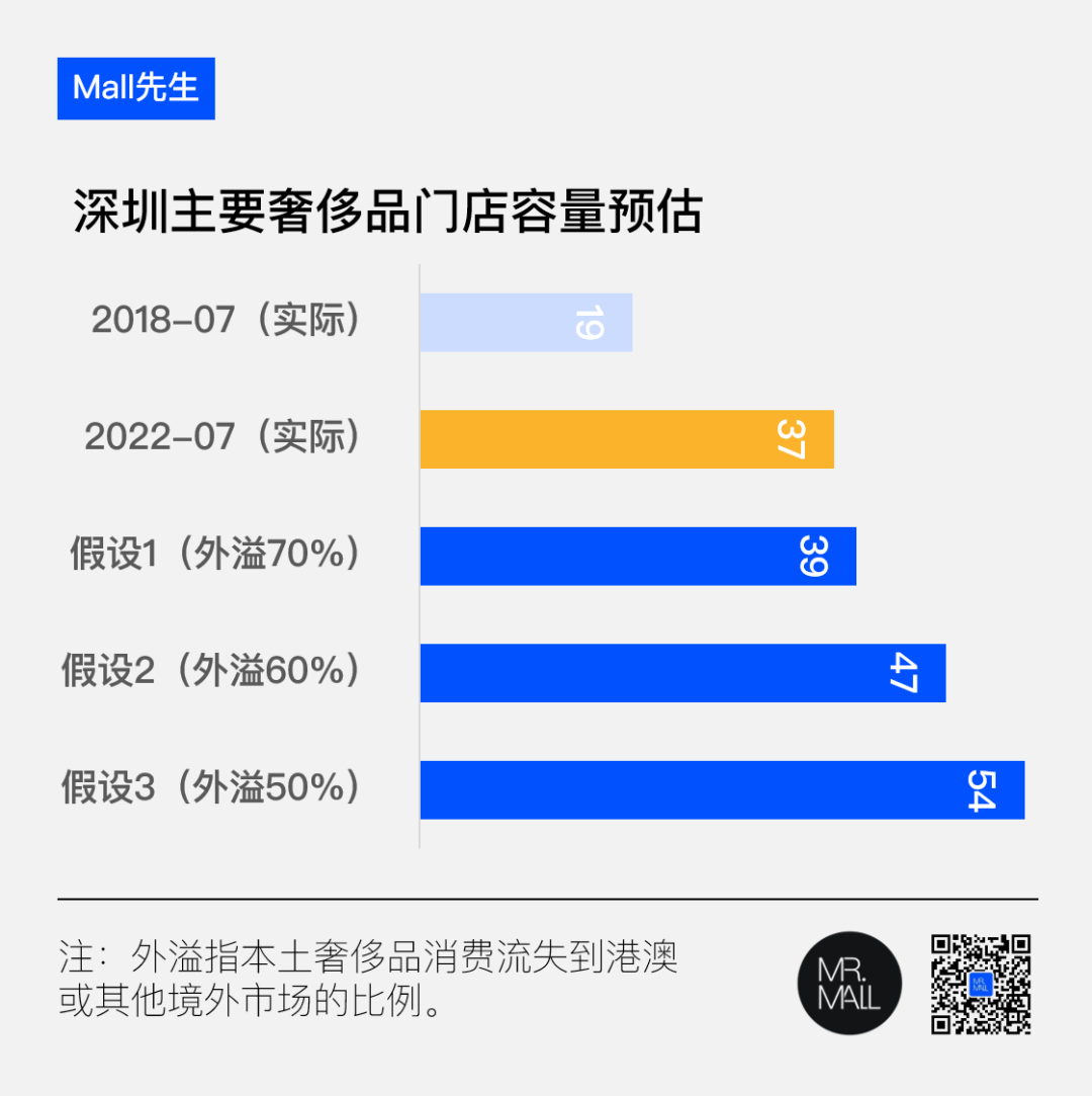 可見,相對于目前已有的門店數(shù)量,深圳還有望容納更多的奢侈品牌和門店(但不一定是一個(gè)品牌開更多門店)。如果按外溢比例控制在50%左右的樂觀估計(jì),深圳奢侈品市場還有50%的擴(kuò)容空間。