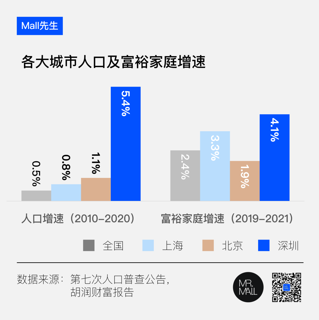 盡管目前,深圳本土的消費(fèi)市場規(guī)模相較于北京、上海仍有很大差距,但與它們相比,深圳有更年輕的人口構(gòu)成、更快速增長的人口和富裕家庭群體。