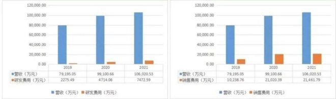 2019年-2021年,未來穿戴的銷售費用分別是10,238.76萬元、21,020.39萬元和21,461.79萬元,占營業(yè)收入的比例分別是12.93%、21.21%和20.24%。同期,公司研發(fā)費用分別為2275.49萬元、4714.06萬元和7472.59萬元,占營業(yè)收入的比例分別為2.87%、4.76%和7.05%。
