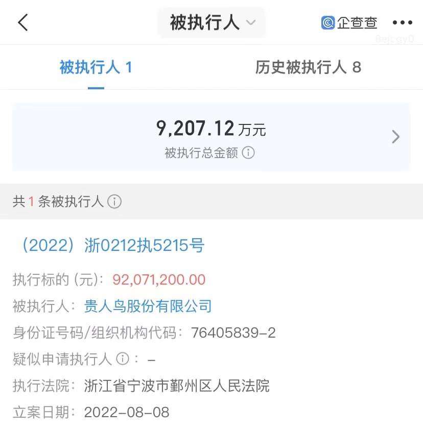 據(jù)企查查APP顯示,8月8日,貴人鳥股份有限公司新增一則被執(zhí)行人信息,執(zhí)行標(biāo)的9207.12萬元,涉及案件為金融借款合同糾紛,執(zhí)行法院為浙江省寧波市鄞州區(qū)人民法院。